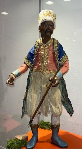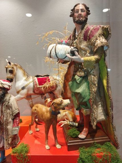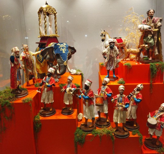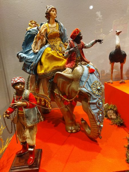 Las pocas referencias de los evangelios canónicos y apócrifos hacia los Magos, contrasta con su fastuosa y deslumbrante presencia en el belén napolitano, construida en base a tradiciones y relatos piadosos o a hechos históricos que permitieron a los artistas imaginar esa carga de lujo y exotismo, sensualidad y hedonismo, privativa de este tipo de belenes. Tal fue el caso de la llegada a Nápoles, en febrero de 1778, del séquito que acompañaba al enviado extraordinario del sultán otomano Abdulhamid I, con el que el Reino de las Dos Sicilias mantenía excelentes relaciones. Con tal ocasión, desfiló por las calles de la ciudad un cortejo muy vistoso, conocido como “el Viaje del Gran Señor de La Meca”, en el que incluso llegaron a participar el propio rey Fernando IV de Borbón y su esposa Carolina de Austria. Del mismo modo, los exóticos animales que suelen aparecer en el cortejo de los Magos pudieron tener una base real, puesto que el mismo Fernando IV contaba con un zoológico en Nápoles, algunas de cuyas curiosas atracciones fueron obsequio de monarcas orientales. Otras peculiaridades del séquito de los Reyes Magos es la presencia de sus refinadas esposas, damas y concubinas, llamadas “georgianas” o “arménides”, de un buen número de músicos, soldados, sirvientes y esclavos, e incluso de dignatarios y soberanos de diferentes reinos que se suman a los Magos para rendir pleitesía ante el Niño.