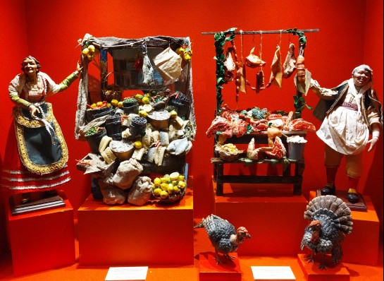 Tanto la hostería como el mercado son dos elementos del belén napolitano en los que las connotaciones religiosas están ausentes; tal es su protagonismo, que ambos casi llegan a eclipsar a la escena de la Natividad. Es en estos dos ámbitos donde más clara queda la inspiración de los artistas en el Nápoles dieciochesco, con sus ruidosas y abarrotadas callejuelas, sus clases sociales, artesanado, las diferentes indumentarias de las distintas provincias del reino, etc. Los comerciantes tradicionales de alimentos (carniceros, fruteros, panaderos, vendedores de aves, ricota, huevos, verduras, etc.) simbolizan el paso de los meses del año. Junto a ellos figuran otros vendedores ambulantes de las más variadas mercancías, clientes, truhanes, artistas callejeros y artesanos con sus talleres. La importancia de este elemento profano y contemporáneo es uno de los aspectos diferenciadores del presepe napoletano, frente a los belenes de otras latitudes.