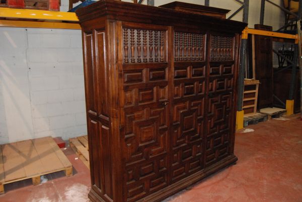 Armario castellano de dos puertas y panel fijo en el centro, adornado con cuarterones y balaustres cantidad