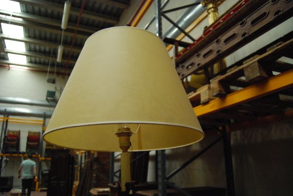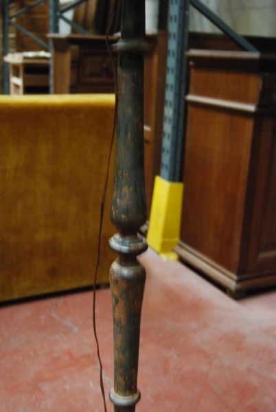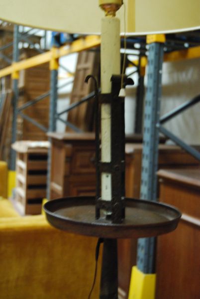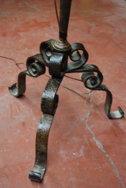 Candelero, candelabro de un solo mechero o hachero de estilo gótico en metal, con pie triangular. Adaptado para lámpara