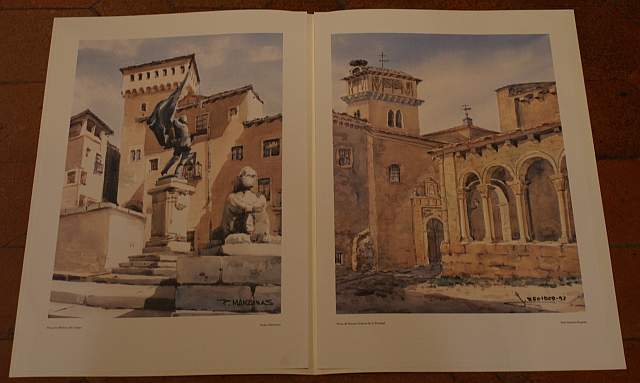 Contiene 2 acuarelas de los artistas Pedro Manzanas y José Antonio Regidor, del Grupo AQUA, realizadas para el Informe Anual de 1993 que la Caja de Ahorros y Monte de Piedad de Segovia dedicó a las Plazas de Segovia.. 50 x 33 cm. 2 páginas. Color.