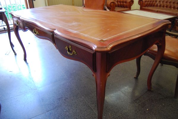 Mesa de despacho en madera con tapete de cuero ocre con tres cajones.