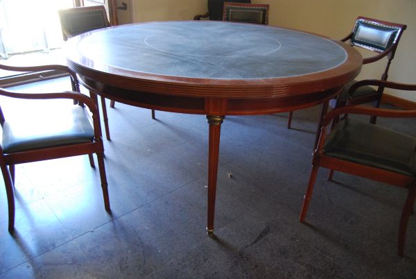 Mesa de reuniones en madera, forma circular con tapete de cuero verde