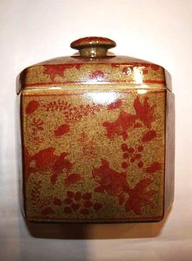 Tibor de forma hexagonal con tapa. Con temática de peces
