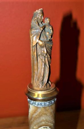Virgen del Pilar tallada en madera sobre columna de mármol y bronce