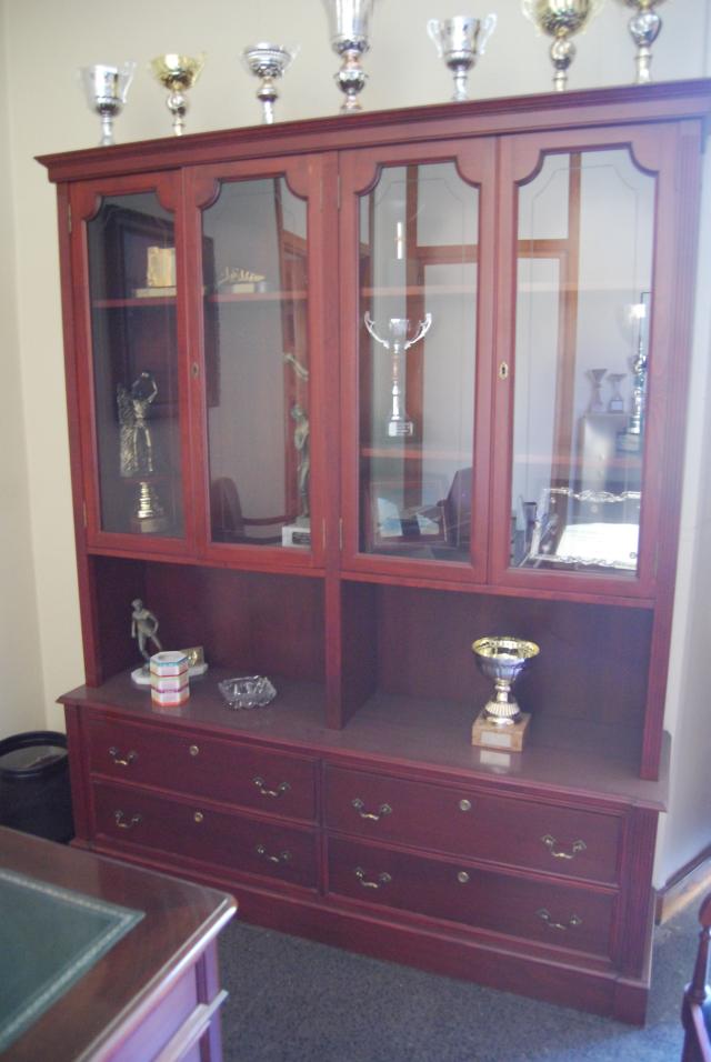 Vitrina de madera con cuatro cajones y 4 cuatro puertas con cristal.