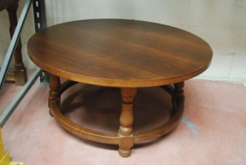 Mesa de reuniones, redonda, de madera con adorno central de cuero y cuatro patas