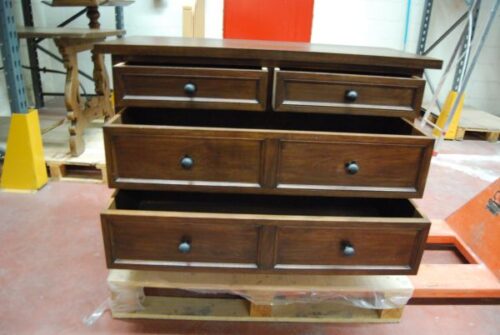 Pareja de aparadores bajos con cinco cajones decorados con cuarterones