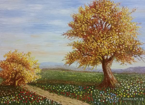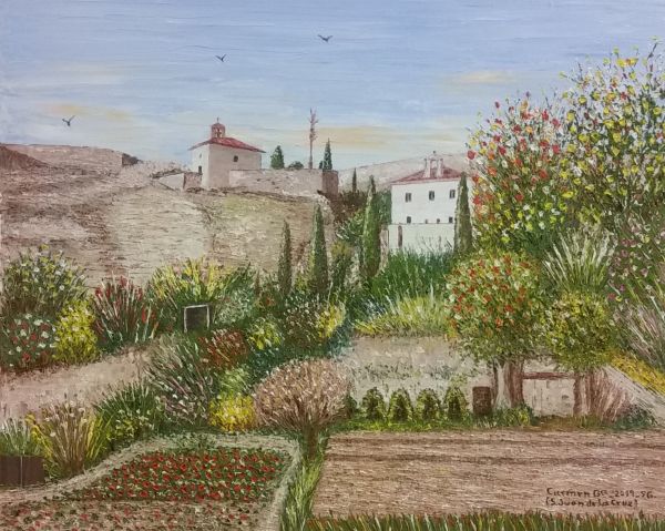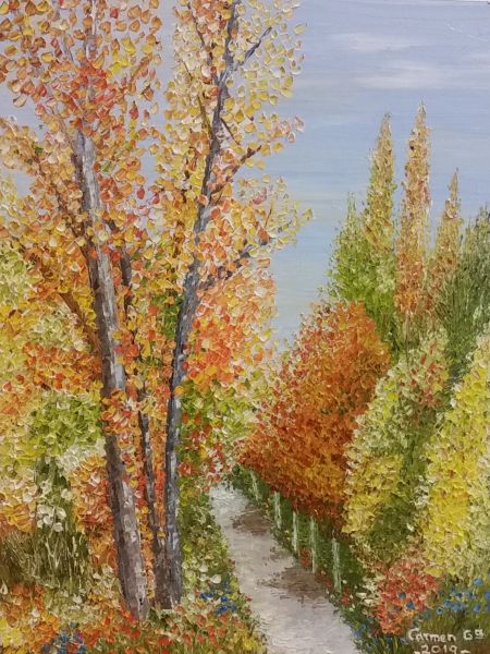 Carmen se inicia en el dibujo desde pequeña y continúa su trayectoria por el instituto, magisterio, el antiguo caserón de Bellas Artes hasta llegar a la Casa de los Picos. Después de aprender la base y distintas técnicas, se encuentra más cómoda pintando con espátula. Juega con esta herramienta y el óleo consiguiendo una pintura realista e impresionista, a la vez, principalmente, en los paisajes.